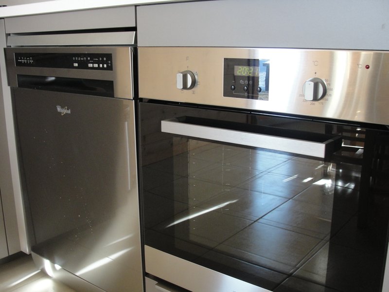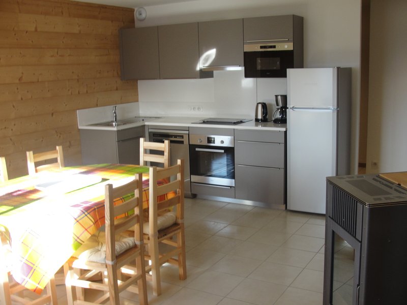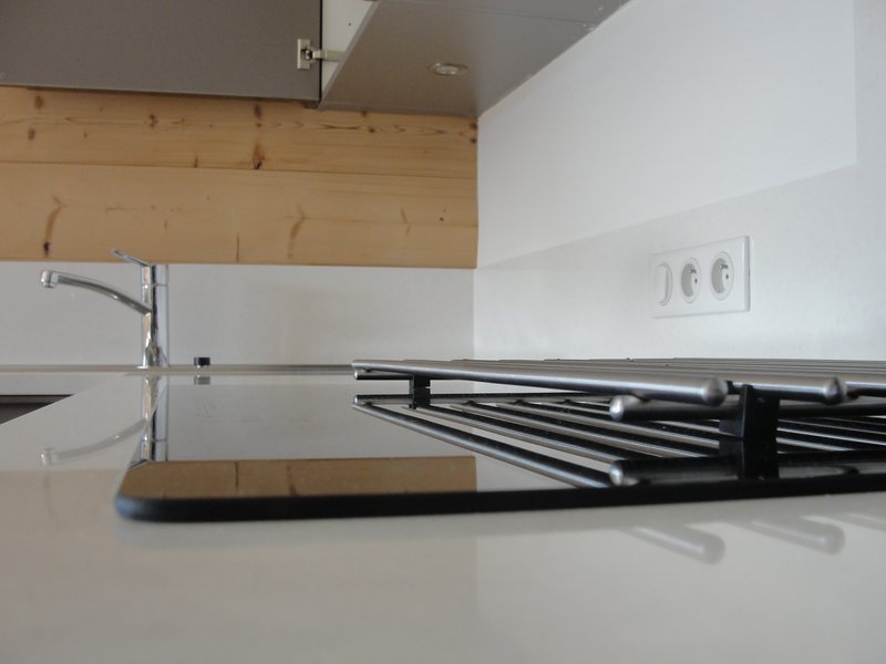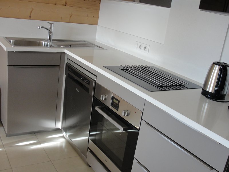 coin cuisine avec 3 plaques à induction, lave vaisselle, four, four à micro-onde, réfrigérateur, congélateur, cafetière, bouilloire et grille-pain électriques …