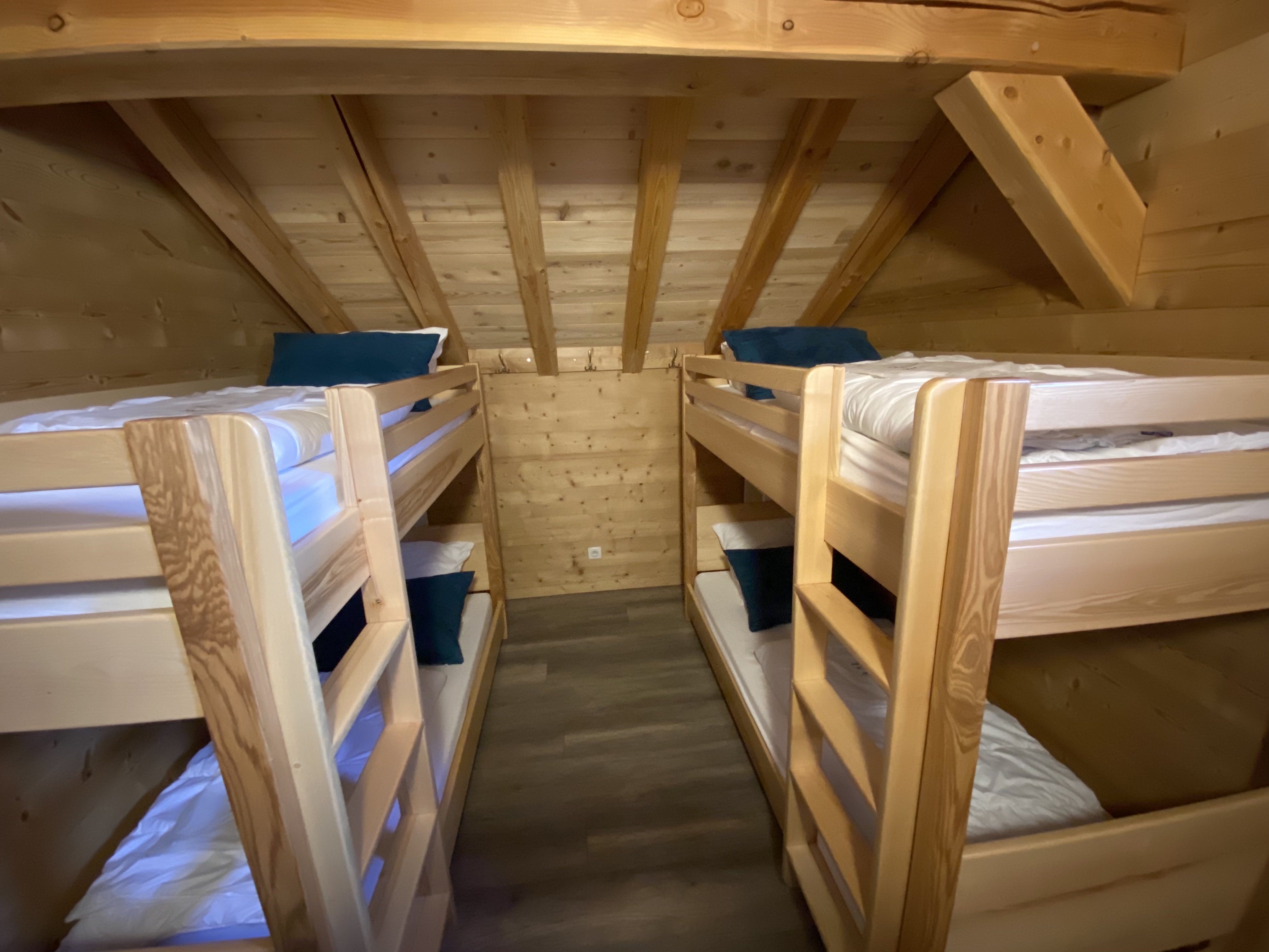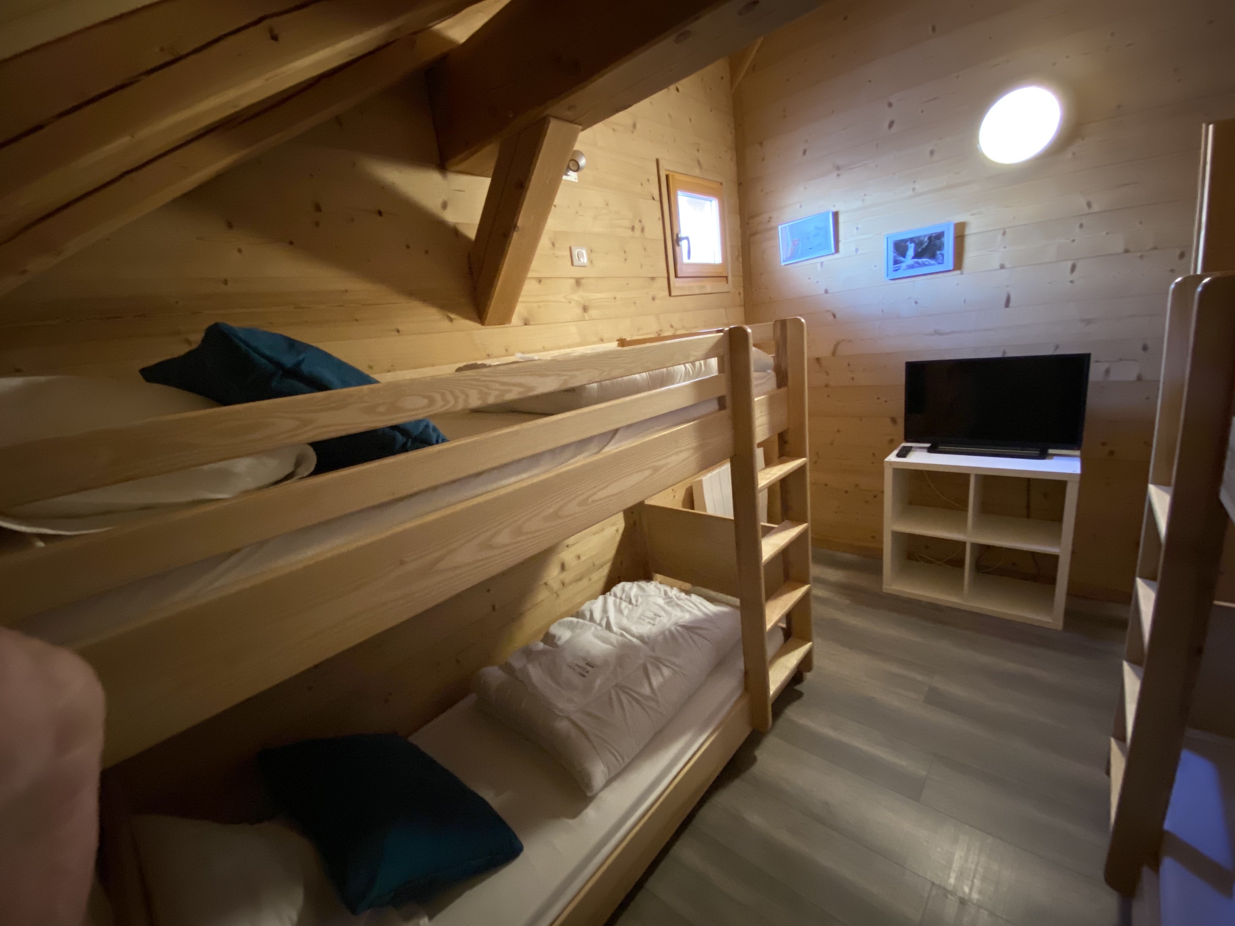 chambre 4 (enfants): chambre 10,5m2 avec 2 fois 2 lits superposés (lit en hauteur ne convient pas aux enfants de moins de 6 ans), rangements , télévision