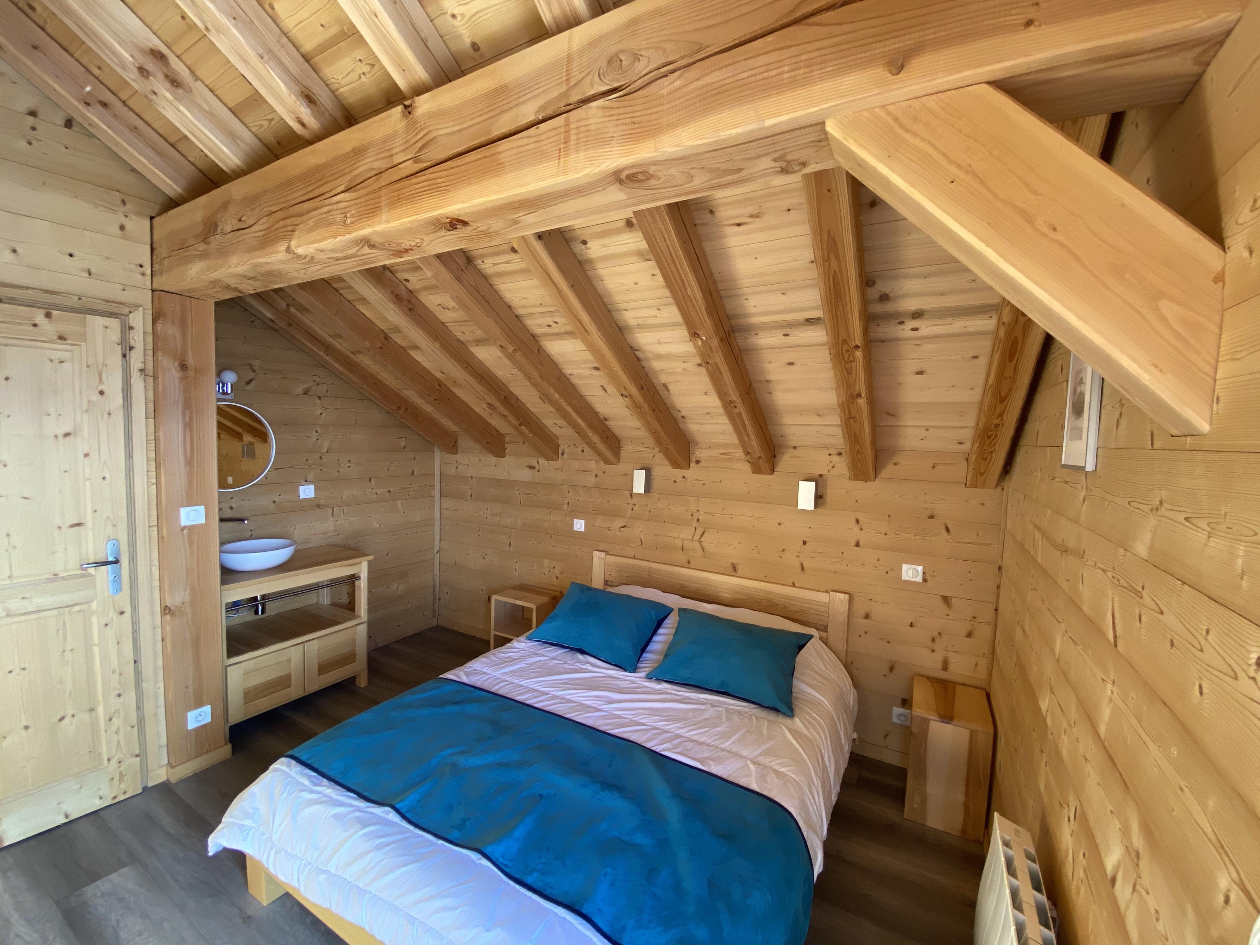 chambre 3 , 13m2 avec un lit double 160x200, rangements, point d'eau, porte fenêtre avec balcon - vue plein sud sur les aiguilles d'arves