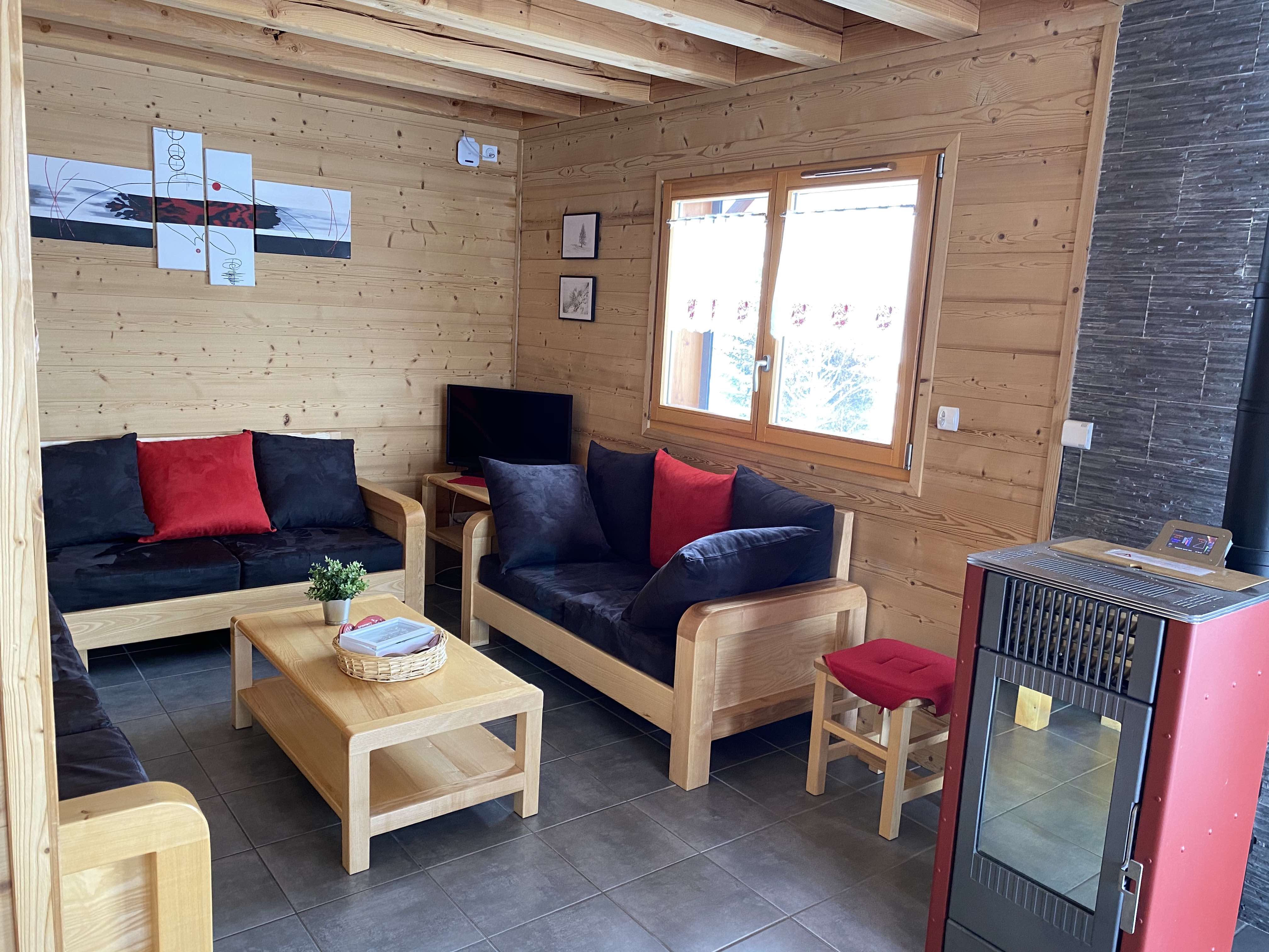 coin détente avec un grand canapé d'angle, table basse et meuble télévision, télévision avec TNT